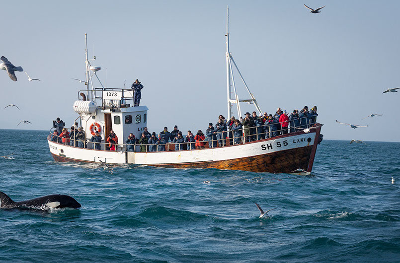 "Killer whales near Grundafjördur village, West Iceland." Iceland's marine life is an important part of its society and economy. The fishing industry is one of its major sources for the economy. Not only does this export support the economy and feed Icelanders, but it also can cause rifts/tensions in the nation which can be further explored here. This photo is from the media bank from the Inspired by Iceland Travel Trade page (i13).