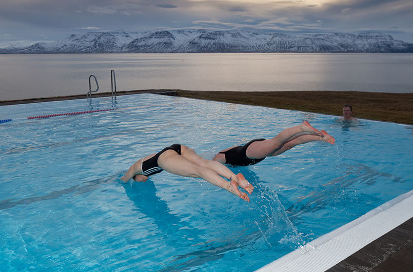 "Swimming in Hofsós village, Northern Iceland." According to my interviews and my research on Icelandic lifestyle, exercise and outdoor activities are a major part of Icelandic life. Iceland brands itself as an active place of adventure. This photo is from the media bank from the Inspired by Iceland Travel Trade page (i14).