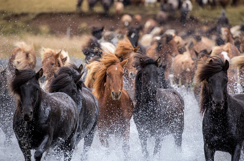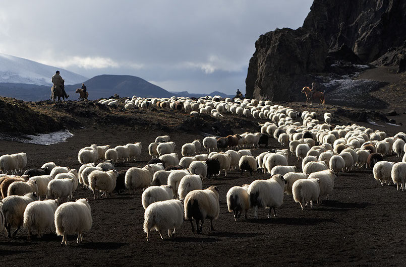 "Rounding the sheep." Sheep herding is a tradition in Icelandic culture. Micaela Leaska explaines, "the sheep free roam (literally anywhere) and can travel far distances in the mountains and you have to gather them all up when the weather starts turning to them have some be slaughtered." This photo is from the media bank from the Inspired by Iceland Travel Trade page (i15).