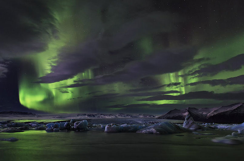 "Dramatic Northern Lights over Jökulsárlón glacier lagoon in southeast Iceland." This photo was taken from Guide To Iceland's Photos of Iceland page. The Northern Lights are a unique part of Iceland. They appear in the winter and can be seen just by looking up. This is a major tourist attraction for Iceland. (i17).