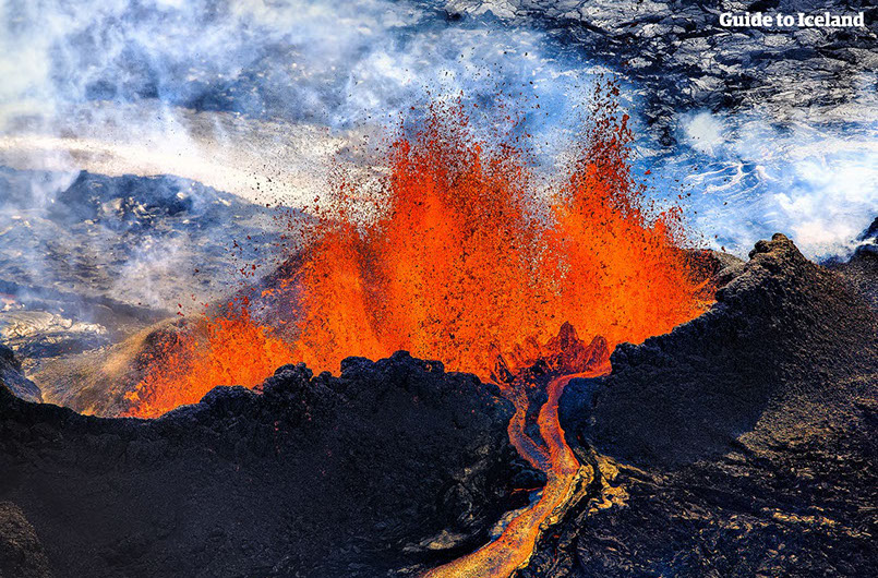 "Iceland is the land of ice and fire, this eruption is from Holuhraun." This photo was taken from Guide To Iceland's Photos of Iceland page. Iceland is one of the most actively volcanic countries in the world. It so active because of its location on the mid-Atlantic Ridge, a divergent tectonic plate boundary, and its location over a hot spot. Of these active volcanic systems, the most active/volatile is Grímsvötn. (i18).
