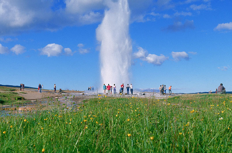 "Strokkur Geyser, South Iceland." This is a photo of one of the many geysers in Iceland exploding. This is actually quite common and frequent in Iceland. The country is known for and relies on geothermal energy and hydropower to power the nation. They are one of the most sustainable countries in the world. This photo is from the media bank from the Inspired by Iceland Travel Trade page. (i12).
