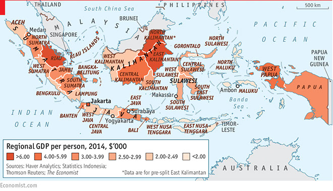 This map shows the regional GDP per person in 2014 in Indonesia. It is important to see where the wealth lies in the country because that has a direct impact on who has the most access to technology and the Internet.