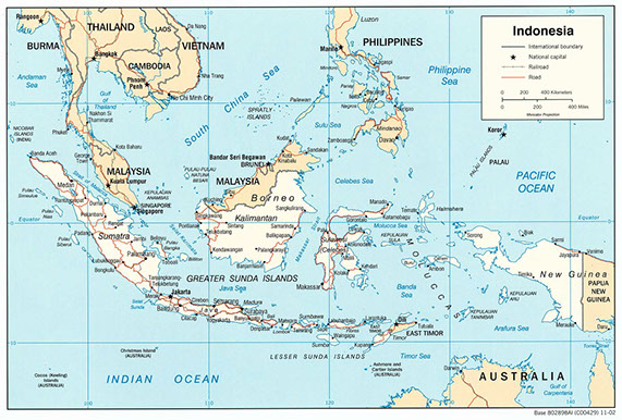 This map displays Indonesia’s location in Southeast Asia. In this map, we can see Indonesia’s neighboring countries and where it falls in relation to the rest of the world.