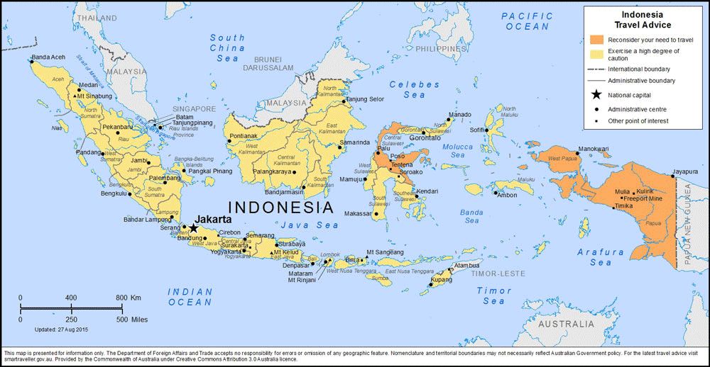 This map of Indonesia is from a The Department of Foreign Affairs and Trade website of the Australian Government. It warns travelers to use a high degree of caution when traveling in Indonesia, as well as regions you should avoid completely. The number one reason being terrorism.
