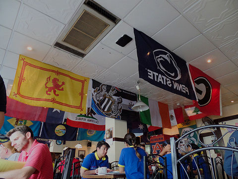 This diner in Doha, Qatar is filled with flags of American icons. The diners also do not seem to be Qatari natives, showing the integration of foreigners into Qatari everyday life. I2