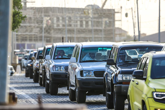 The photograph demonstrates bustling city life, and reveals some pretty interesting cultural facets, as well. Each visible driver is a man wearing traditional Muslim dress driving nearly the same type of car. There are no visible women. The bumper-to-bumper traffic consists mostly of four-wheel drive vehicles in front of a background of construction. I3