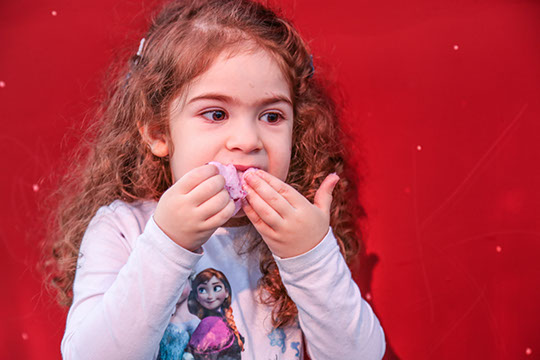 A young girl eats at the 2017 Qatar International Food Festival. Food is a large part of family life in Qatar. The girl is wearing a Disney’s Frozen shirt, showing the impact of Western media in Qatar, even on young children. I6